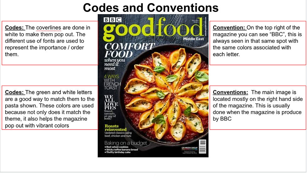 Codes and Conventionsjeronimocastano200Oct 4, 20241 min readUpdated: Oct 16, 2024In class we were learning about Codes and Conventions, I do not really get what the difference is between them, but he is my best attempt: